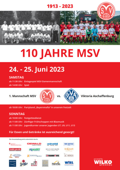 Bald ist es soweit! Mit einem abwechlunsgreichen Festprogramm feiert der MSV sein 110jähriges Bestehen. Mit 2 interessanten Partien (s. beiliegendes Werbeplakat) bestreitet der MSV den ersten Tag seines Jubiläums, welcher mit einem Festzeltabend mit musikalischer Unterstützung der Band Bayernmafia seine Abrundung findet.