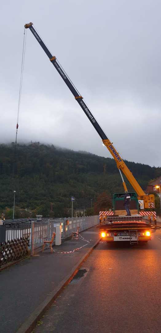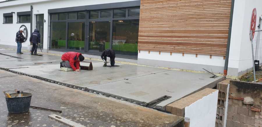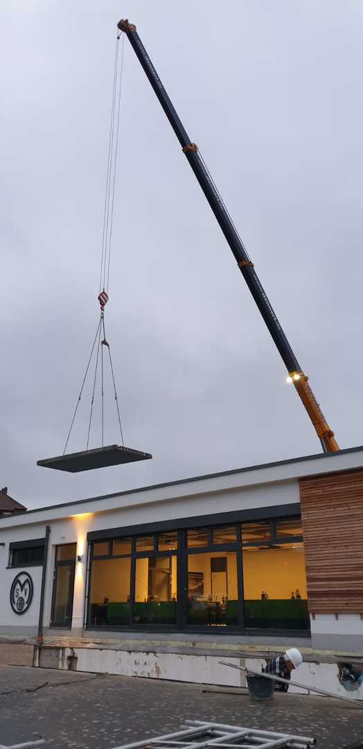 Am 15.Oktober.2020 erfolgte die Lieferung und Montage von neun einzelnen Betonfertigelementen. Welche zukünftig, nicht nur die neue Terrasse der Vereinsgaststätte bilden, sondern auch den stillgelegten Teil des alten Vereinsheimes für immer verschließen.