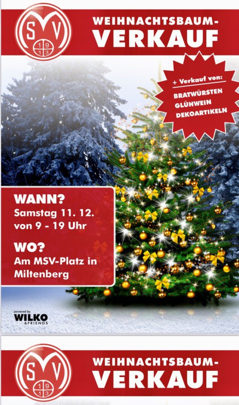 Der Miltenberger Spielverein 1913 e.V. veranstaltet am Sa. 11.12.2021 zwischen 09.00 - 19.00Uhr seinen 2. Weihnachtsbaumverkauf im Außenbereich auf seinem Sportplatz für alle Interessenten. Natürlich werden nicht nur Vereinsmitglieder mit den tollen Tannen ausgestattet ;-)...