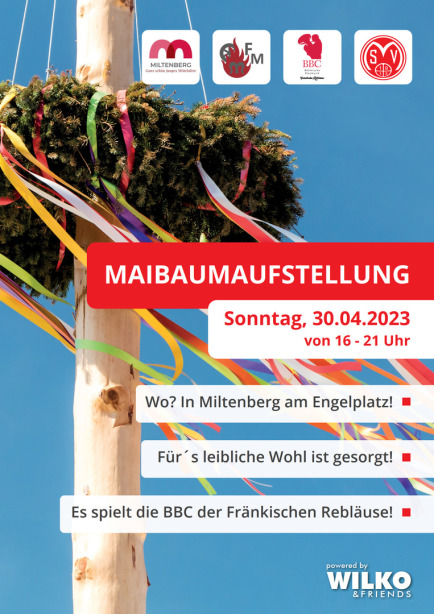 Am 30.04.2023 um 16:00Uhr ist es wieder soweit! Der Maibaum wird aufgestellt. Bei Blasmusik, Bratwürsten und einem kühlen Bier feiert Miltenberg die traditionelle Aufstellung des Prachtstücks. In Zusammenarbeit mit der Feuerwehr Miltenberg, den Fränkischen Rebläusen und dem Miltenberger Spielverein 1913 e.V. führt die Stadt die Festveranstaltung durch.